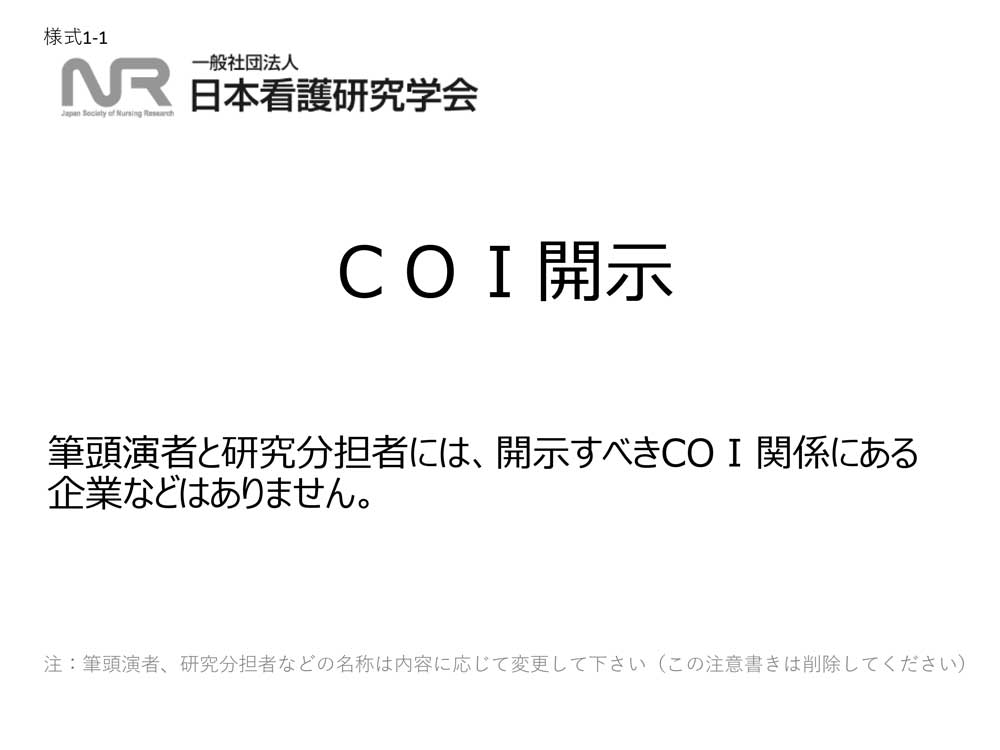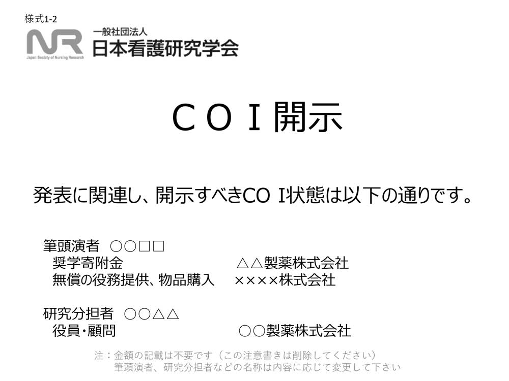 下記の「日本看護研究学会第52回学術集会開示すべき利益相反事項と基準について」をご確認の上,発表内容に関係し,演題発表者全員の過去1年間におけるCOI状態にある企業・組織や団体があれば,発表時に使用する媒体に明記してください。 - 口演の場合は演題名・研究者氏名の次のページ(パワーポイントファイル)に,示説の場合はポスターの最後に,記載例を参考に掲載してください。