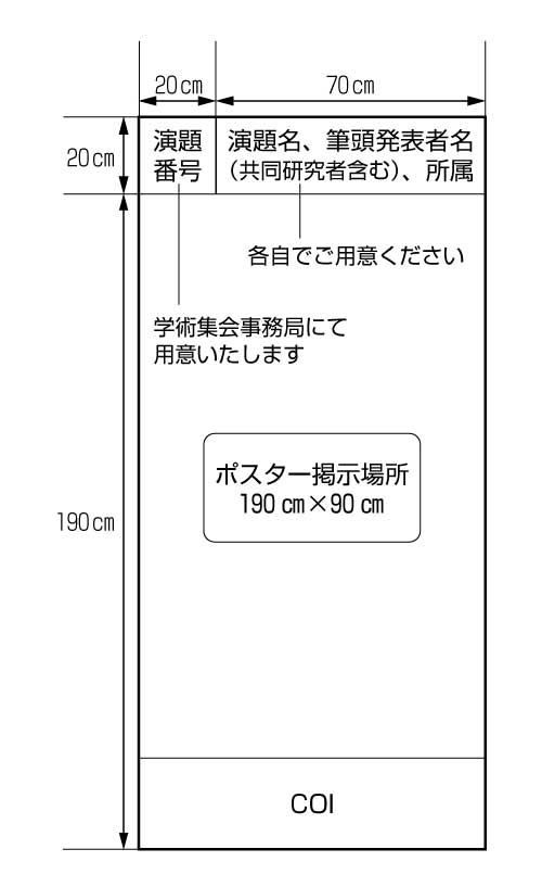 - ポスター本文とは別に,縦20 ㎝×横70 ㎝の大きさに,演題名,演者(発表者,共同研究者)の所属と氏名を記入したものをご準備ください。